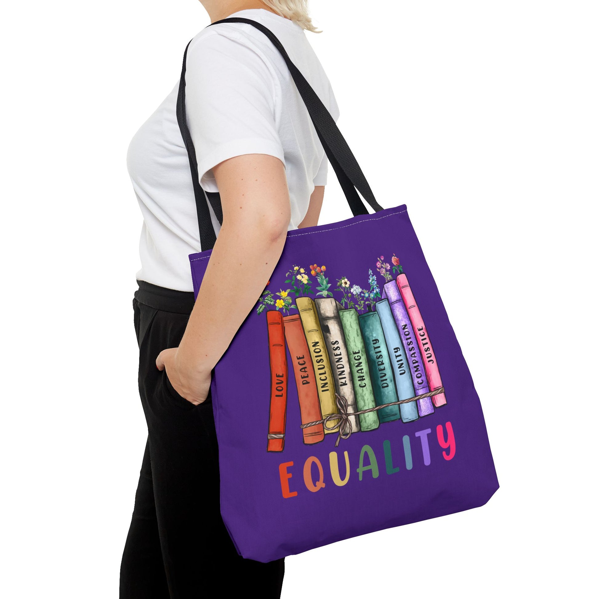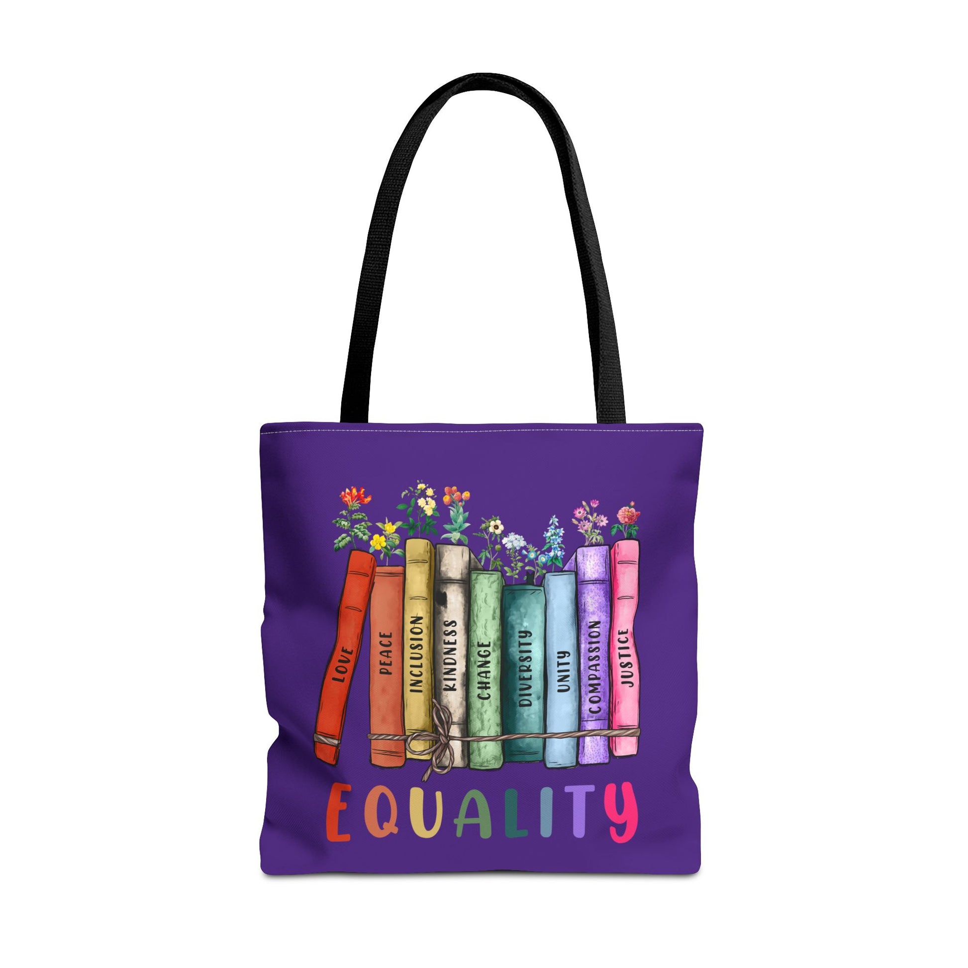 Books build empathy—and this tote says it loud and proud. Featuring a purple background, bold “Equality” bookstack design with floral accents, and sturdy black handles, this bag is a beautiful celebration of inclusion, representation, and love in all forms.